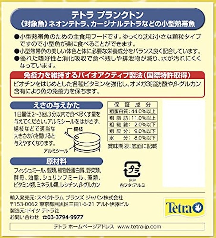 ネオンテトラは、全長1cmから3cmと幅があります。大きい子も小さい子も 楽にエサを食べれるように、小粒のエサをご購入下さい。 なお、エサは小粒一種類で充分です。ネオンテトラはカラシン科の魚なので カラシン用、ネオンテトラ用の餌を使って下さい。. 金魚向け テトラ (Tetra) フィン 0g テトラ (Tetra) ※ 参考価格¥ 1,426 ※ amazon ¥ 772 ※ charm ¥ 722 ※ 金魚用のエサです。 テトラ社はアクアリウム業界で実績あるメーカーで、魚のエサも評価が高いです。 金魚の餌として、多くの愛好家に支持されて. ★餌おすすめ商品★ プロ推薦海水魚の人工餌おすすめ12選!お役立ち情報満載! プロのおすすめ海水魚の冷凍餌種類別一覧!コペポーダ・ブライン・ホワイトシュリンプ プロおすすめ海水魚の『生餌』種類別一覧!魚・エビ・貝など全網羅!.